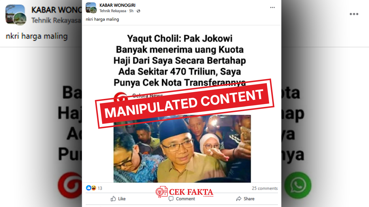 Klaim bahwa Presiden Jokowi menerima uang Rp470 triliun kuota haji dari mantan Menag Yaqut merupakan hoaks dengan kategori konten yang dimanipulasi (manipulated content).