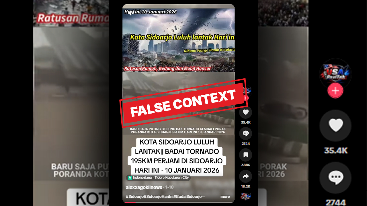 Dengan demikian, narasi bahwa Sidoarjo luluh lantak akibat badai tornado 195 km per jam pada 10 Januari 2026 adalah SALAH. Masyarakat diimbau untuk selalu memverifikasi informasi cuaca melalui kanal resmi BMKG dan tidak mudah terperdaya oleh konten yang disajikan secara dramatis tanpa sumber yang jelas.