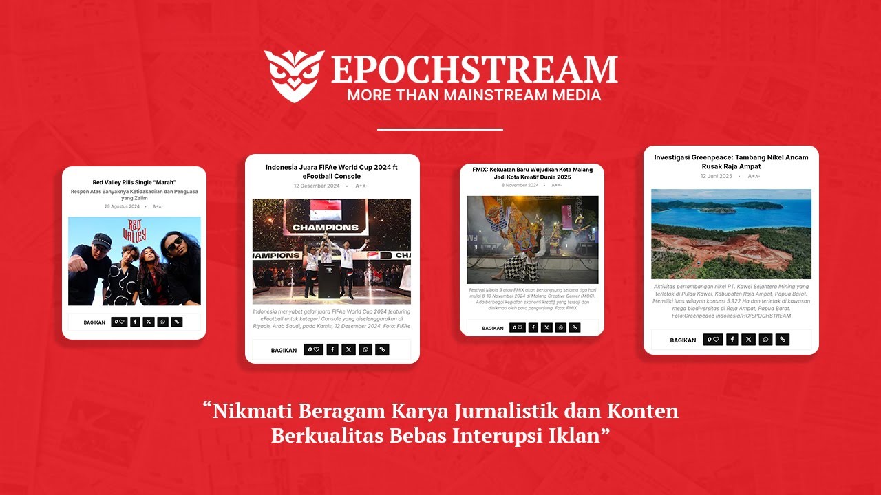 EPOCHSTREAM adalah media independen yang lebih dari sekadar media mainstream dengan sajian karya jurnalistik dan konten berkualitas bebas interupsi iklan. Kami percaya bahwa informasi berkualitas adalah kunci utama membangun masyarakat madani.