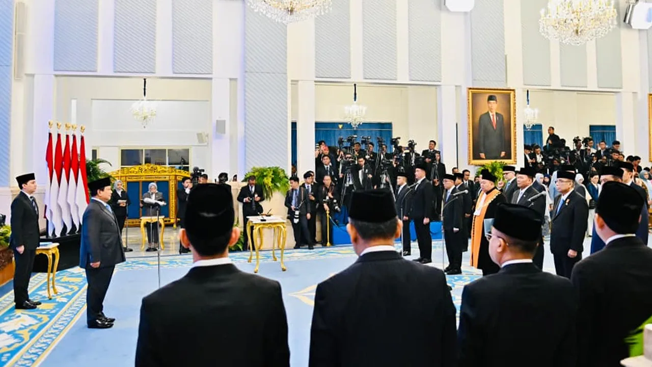 โBahwa saya akan setia kepada Undang-Undang Dasar Negara Republik Indonesia Tahun 1945 serta akan menjalankan segala peraturan perundang-undangan dengan selurus-lurusnya, demi darmabakti saya kepada bangsa dan negara,โ ujar Presiden Prabowo saat mendiktekan penggalan sumpah jabatan kepada pejabat yang dilantik.